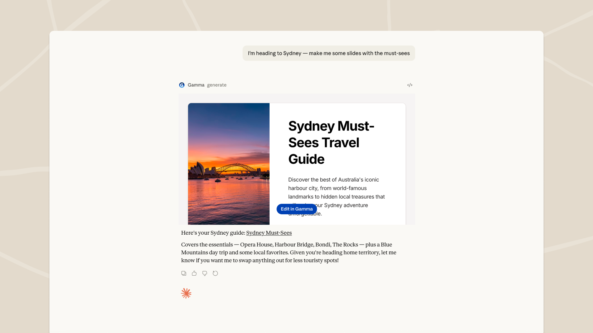 You can use Gamma in Claude to: